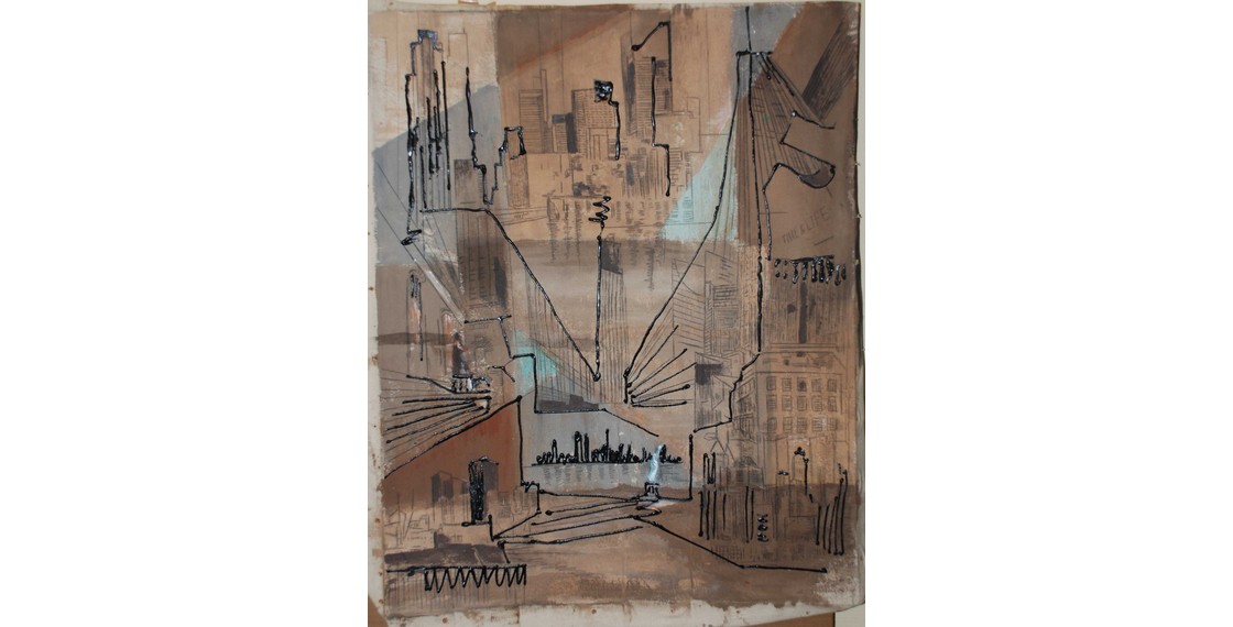 В.В.Иляхинский. Без названия. [Мост]. Нью-Йорк, США. Вторая половина XX в. Бумага (серая), гуашь. 22,8 х 30,5