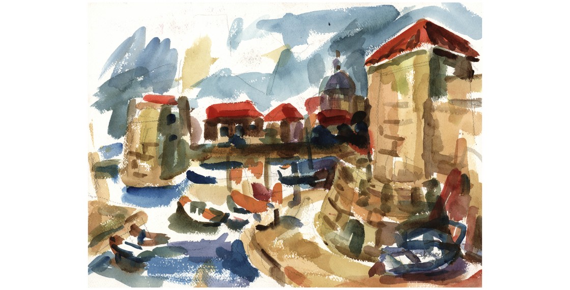 В.В.Иляхинский. Без названия. [Город на берегу]. США. 1985. Бумага, акварель (по рисунку карандашом). 26,0 х 36,0