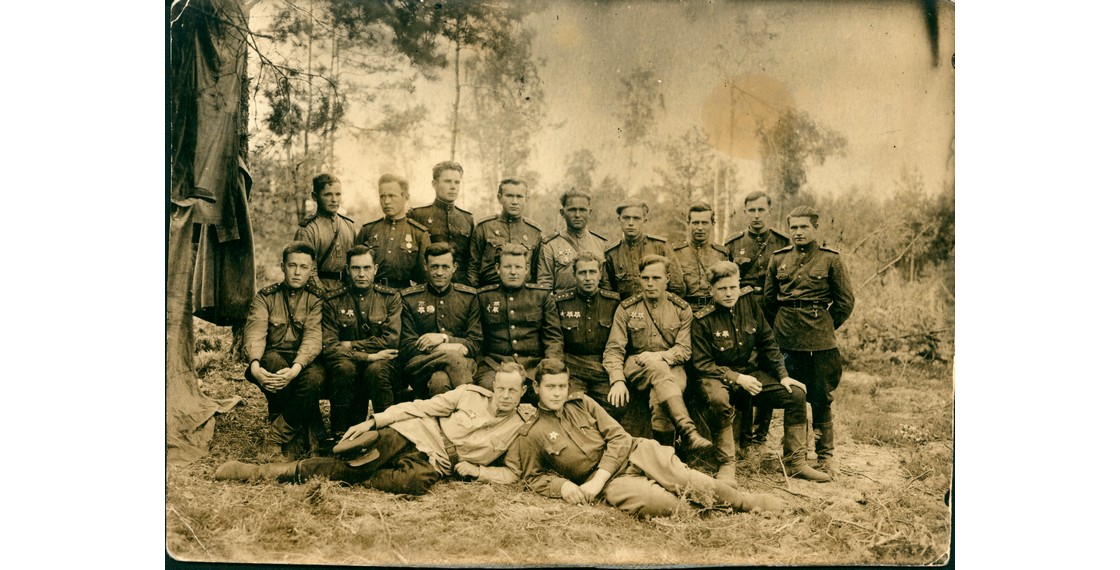 Офицеры разведдивизиона. Капитан Солженицын сидит первый слева. Белорусский фронт. Осень 1944