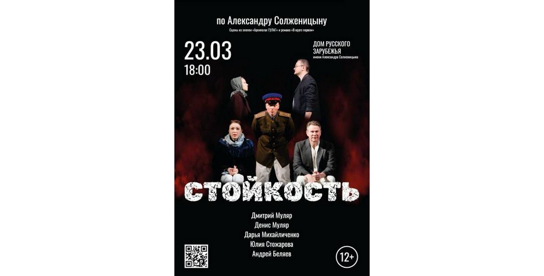 Афиша спектакля «Стойкость», поставленного к 50-летию публикации книги «Архипелаг ГУЛАГ». Дом русского зарубежья им. А.Солженицына, Москва. Россия. Март 2024