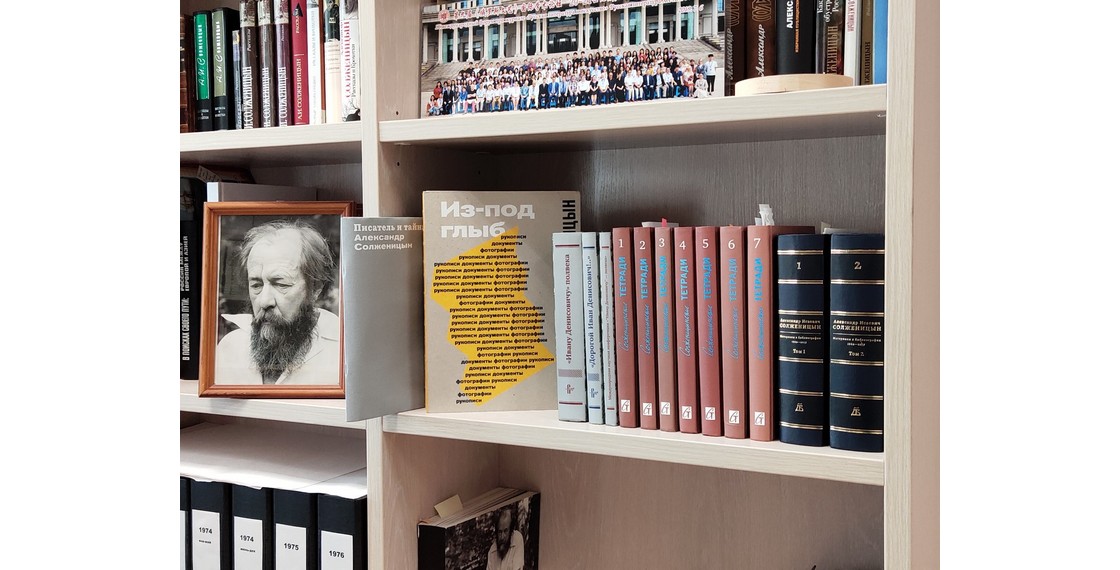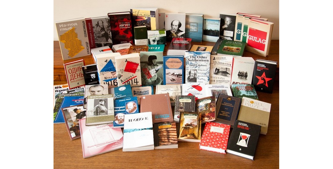 Полка с изданиями отдела по изучению наследия А.И.Солженицына Дома русского зарубежья, вышедшими из печати в 2011–2018 годах