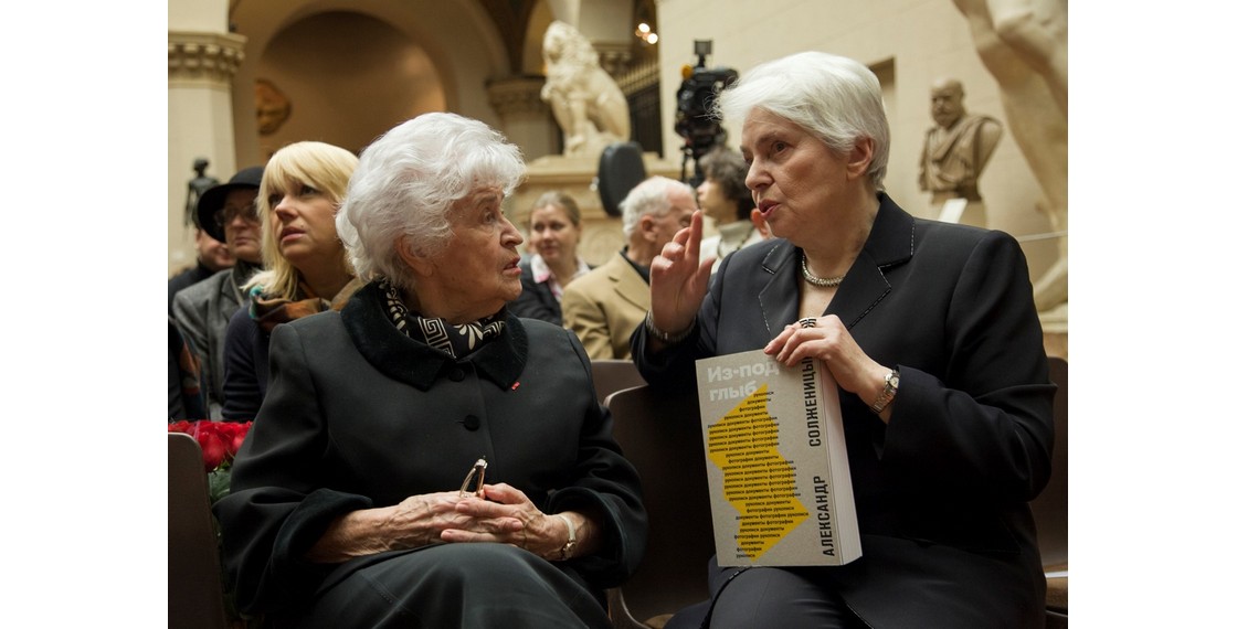 Президент ГМИИ И.А.Антонова и Н.Д.Солженицына на вернисаже. Москва, Россия. Декабрь 2013