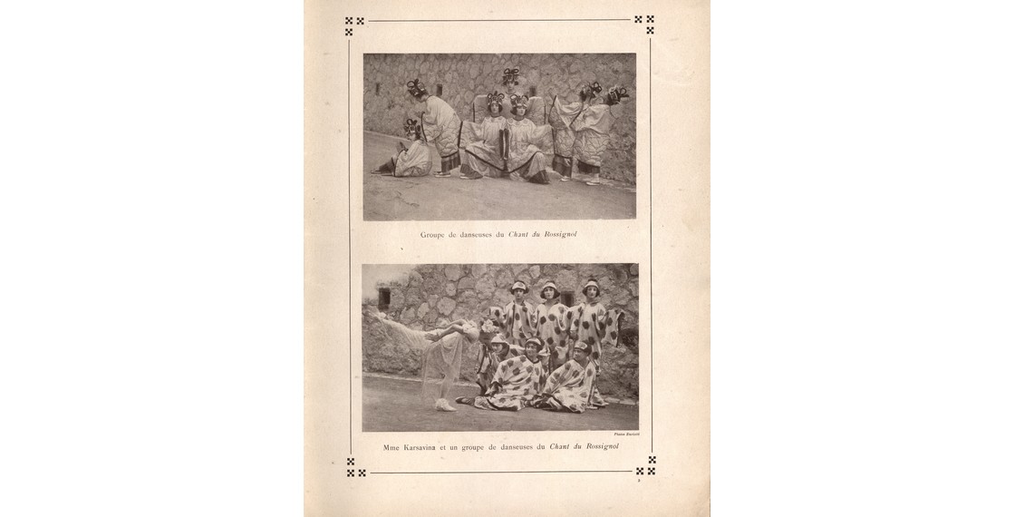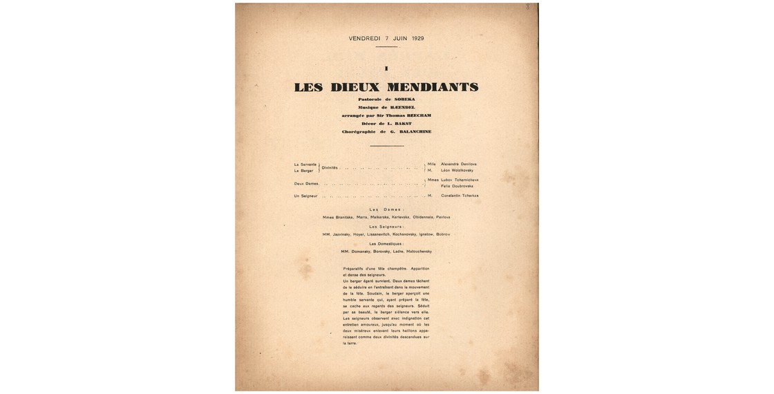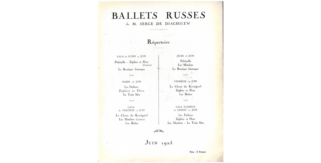 Рекламный буклет 1925 года с репертуаром, показанным с 15 по 20 июня в парижском театре Гетэ-Лирик (Théâtre de la Gaîté Lyrique), был также приобретен Домом русского зарубежья у А.А.Геллера. На первых листах — перечень постановок: балеты «Пульчинелла», «Зефир и Флора», «Докучные», «Синий поезд», «Волшебная лавка», «Песнь соловья», «Матросы». Далее в буклете помещены фотографии артистов и сцен из постановок.