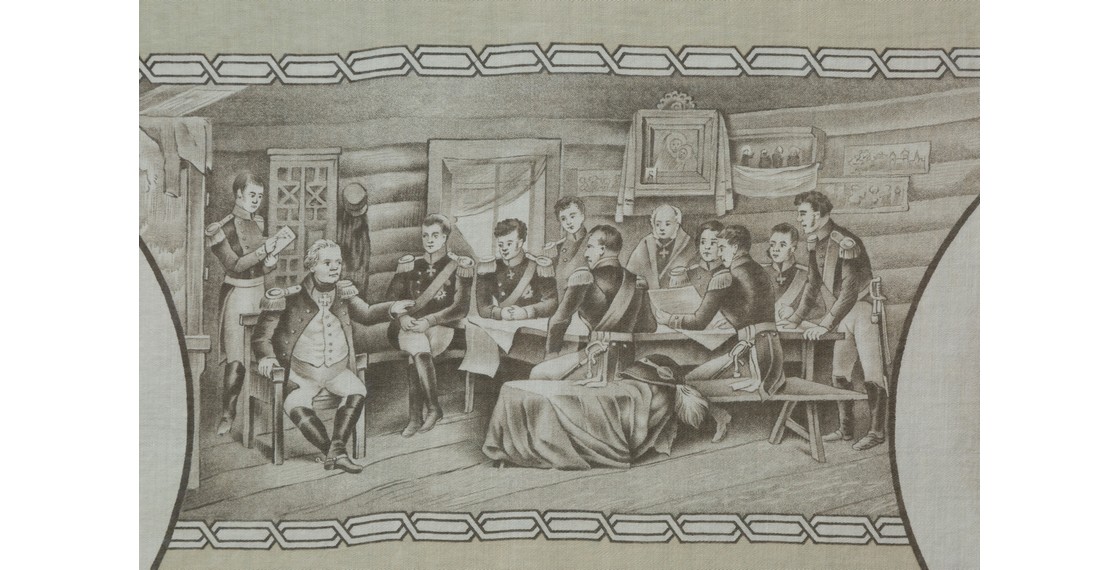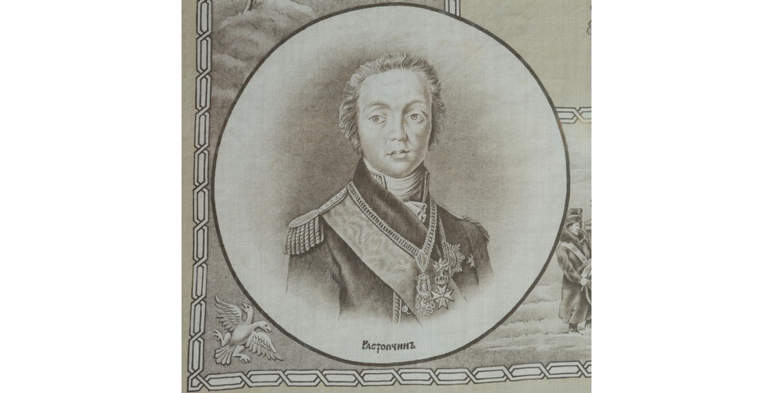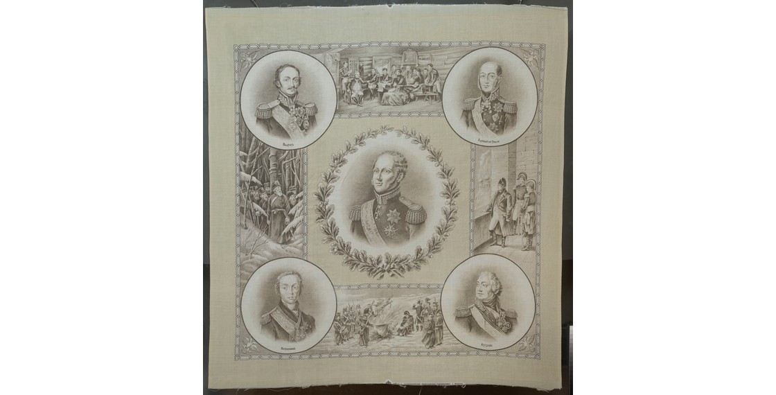 Предлагаемый вашему вниманию юбилейный памятный платок можно назвать наиболее торжественным и содержательным. В центральной части полотна изображен император Александр I в дубовом венке, по четырем сторонам от него в круглых медальонах — подписные портреты Матвея Ивановича Платова, Михаила Богдановича Барклая-де-Толли, Федора Васильевича Ростопчина и Михаила Илларионовича Кутузова. Между ними в прямоугольных картушах сюжеты картин В.В.Верещагина «В Кремле — пожар!», «Не замай! Дай подойти», А.Д.Кившенко «Военный совет в Филях», «Сжигание орлов Великой Армии». У нижнего края платка — печатное клеймо: «MANUFACTURE PROKHOROFF TREKHGORNY à MOSCOU».