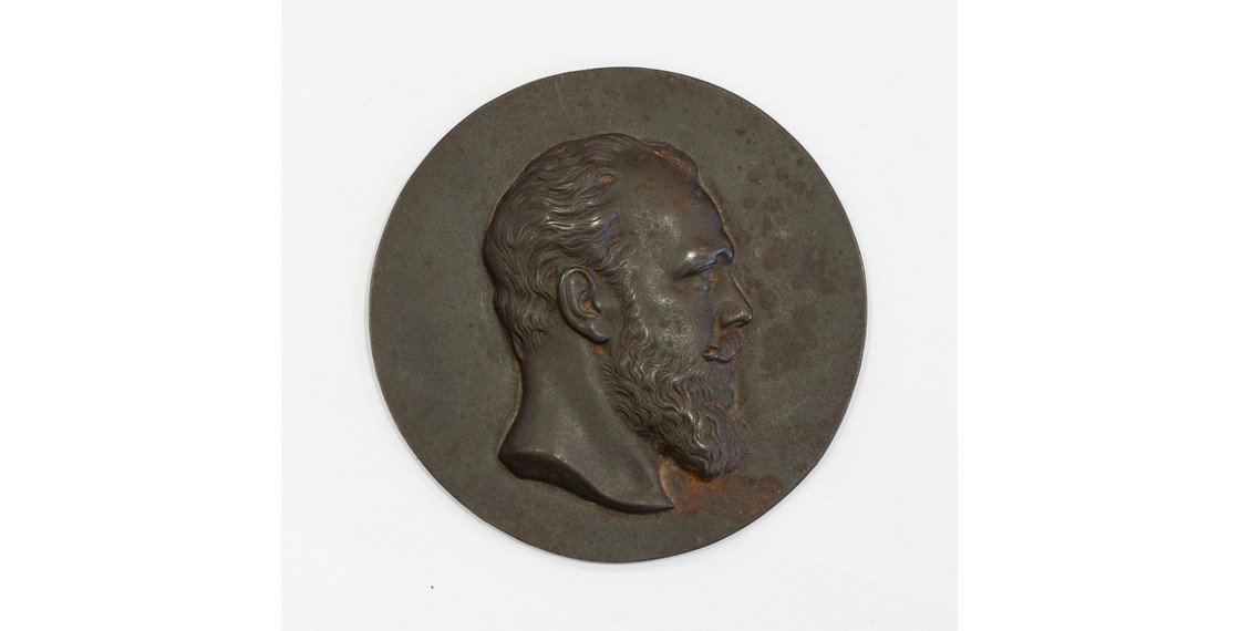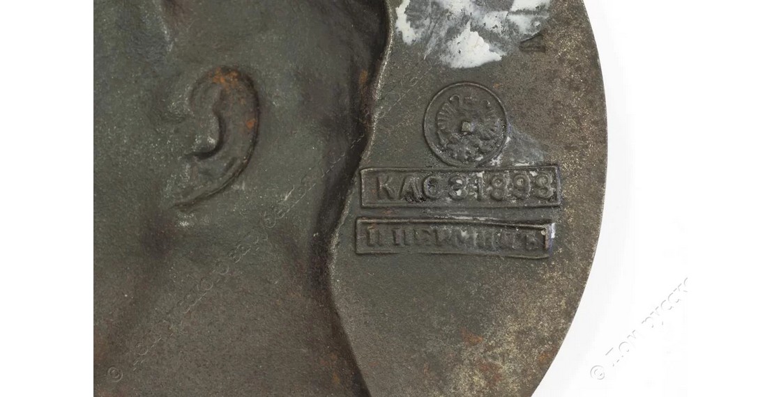 Чугунный медальон с барельефом профиля императора Александра III выполнен в 1883 году по модели С.Ф.Важенина, мастера медальерного искусства, создавшего свыше сорока медалей и барельефов на самые разные темы. На оборотной стороне барельефа — круглый оттиск с изображением российского гербового орла и два клейма в прямоугольных рамках: «КАС.З.1898» и «П.ПЕРМИНЪ». Это визитные карточки изделия, дающие исчерпывающую информацию о том, где, когда и кем было выполнен медальон.