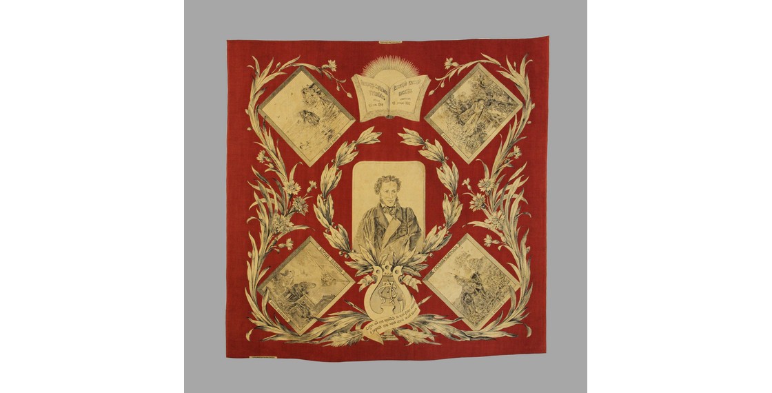 Редкий памятный платок, посвященный 100-летнему юбилею со дня рождения А.С.Пушкина, был отпечатан в 1899 году на Даниловской мануфактуре, одном из самых передовых ситценабивных предприятий.