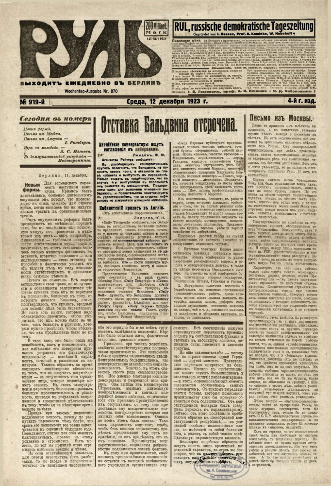Ежедневная берлинская газета «Руль» была основана в 1920 году видными представителями партии кадетов Августом Исааковичем Каминкой (1865–1941?), Владимиром Дмитриевичем Набоковым (1869–1922) и Иосифом Владимировичем Гессеном (1865–1943), последний всецело взял на себя переговоры с Издательством Ульштейн. Договор был подписан 5 ноября 1920 года. По условиям соглашения издательство в качестве компаньона брало на себя печать, сбыт и рекламу издания, входило в наблюдательный совет (два представителя) и предоставляло редакции «Руля» помещение в Ульштейнхаус (Ullsteinhaus) на Кохштрассе (Kochstraße, 22–26). Сам Гессен, несмотря на активное участие в переговорах с немецкой стороной, крайне скептически оценивал перспективы кадетского печатного проекта в эмигрантских условиях: «Подсознательно играло, вероятно, некоторую роль и ощущение деградации в смене крупного петербургского органа печати, каким была “Речь”, интересовавшая и европейское общественное мнение, на скромный беженский листок» (Гессен И.В. Годы изгнания. P.: YMCA-Press, 1979.С. 115). Однако опасения Гессена не оправдались, и газете «Руль» было суждено стать не только заметным рупором партии кадетов, но и одним из самых авторитетных периодических изданий русского зарубежья.