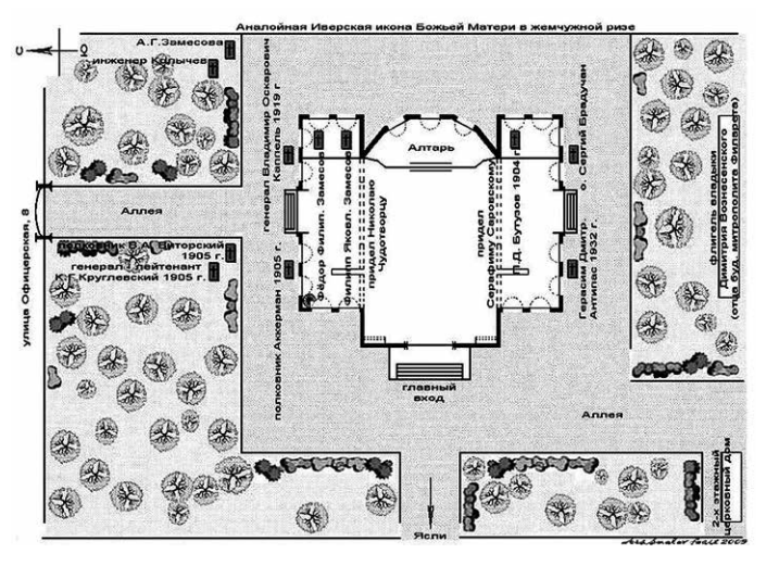 храма-памятника совершались многочисленные захоронения, так, у северной стены был похоронен Георгиевский кавалер генерал-лейтенант В.О. Каппель Иверская церковь в Харбине – показательный пример культового сооружения, где традиция увековечения событий и людей с помощью росписей на сюжеты из христианской истории вытеснялась батально-патриотическими полотнами и мемориальными досками (своеобразными документами), а сам храм превращался в памятник русской истории и культуры. У южной и северной стен храма (1883–1920) и другие известные участники военных событий.
