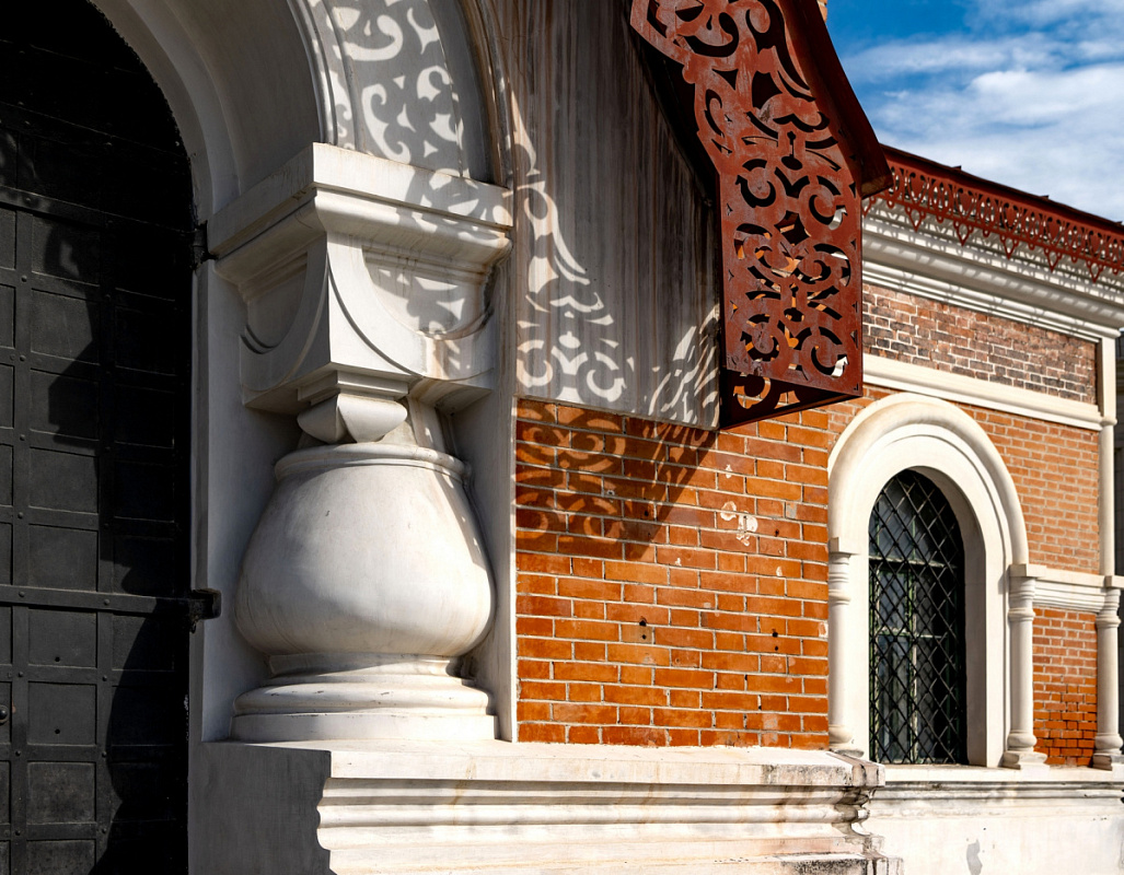 Строгая симметричность, уравновешенность сооружения, подчеркнутая «стилобатной» частью первого этажа не является характерной чертой для национально-романтической темы. Но статус Пантеона воинской славы обусловил выбор симметрично-осевой композиции, наиболее полно выявляющей мемориальную функцию церкви-монумента. Это не исключение, а скорее правило для храмов с мемориально-поминальной функцией.