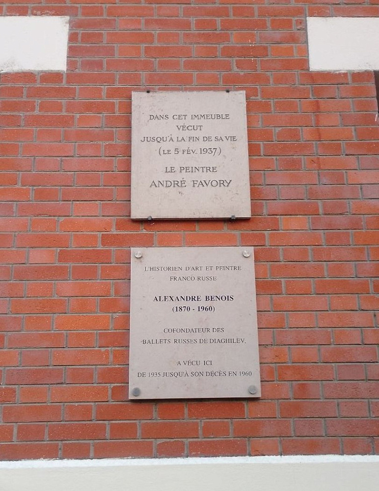 Двухэтажная квартира располагалась на четвертом (пятом по принятой в России нумерации) этаже в доме на улице Огюста Виту, неподалеку от завода «Ситроен». А сам дом располагался в XV квартале Парижа, где обитало большинство не очень состоятельных русских эмигрантов. Здание было построено незадолго до того, как здесь обосновалась семья Бенуа, и было оборудовано лифтами. Парадная дома выходит на ул. Огюста Виту, а фасад и окна – на авеню Эмиля Золя (avenue Émile-Zola). Кроме просторной двухэтажной квартиры Александр Николаевич занимал на последнем этаже еще одно помещение. Он называл его «архивная комната». Здесь он работал над своими статьями и книгами, здесь же хранились библиотека и архив, к которому художник составил тщательную опись.