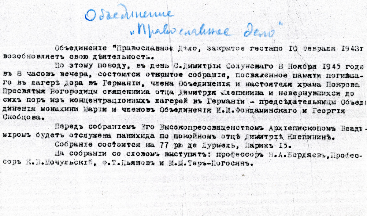 Листовка-брошюра объединения «Православное Дело», отпечатанная типографским способом для распространения среди русских эмигрантов. Б.д. (Архив Софьи Вениаминовны Медведевой, Париж, Франция).