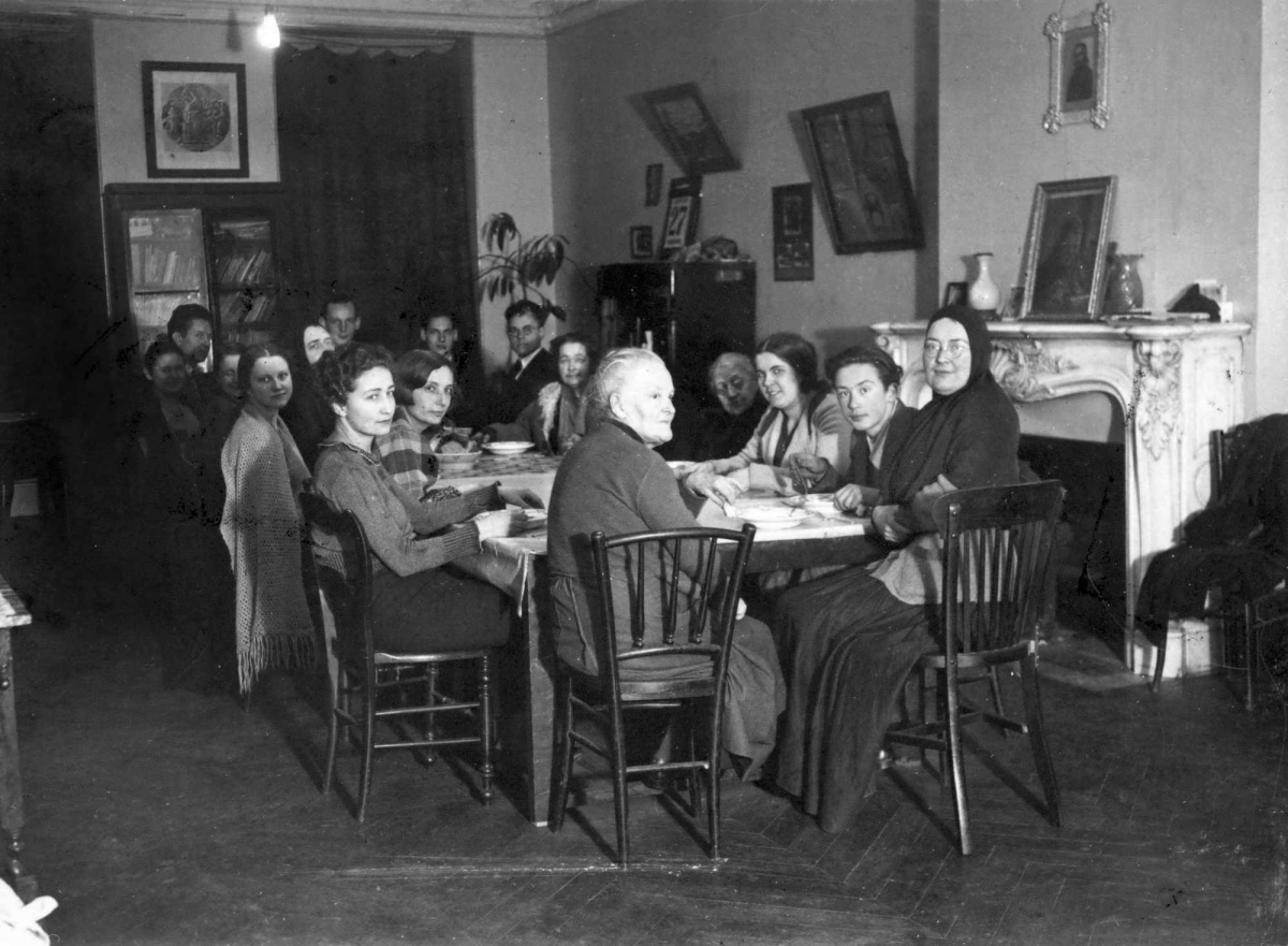 Одной из достопримечательностей дома матери Марии, несомненно является ее столовая: ничего похожего на обычные благотворительные или полу-благотворительные “обжорки”. В большой светлой комнате накрыт ряд круглых и квадратных столиков. В плетеных корзинках — хлеб. Прислуги, подающей к столу, не существует, и все обедающие сами идут за блюдами. Первое (борщ, щи или суп) и второе (жареное мясо с гарниром, рыба и т.п.) стоит … 1 фр. 50 сантимов. Отдельно второе или сладкое — 50 сантимов. Напитки — пиво, квас, сидр — 25 сантимов за стакан. Все приготовлено исключительно вкусно и чисто. Впрочем — чистота во всем: и в хорошо вымытой посуде, и в белоснежных скатертях, и в начисто вытертых стаканах… Приветливое и любезное обращение служащих придает всему какой-то домашний, “не казенный” характер…»