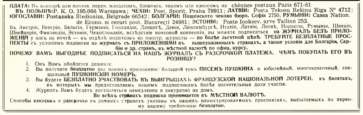 “Иллюстрированная Россия” выходит еженедельно. Читатели могут получить розничные номера, начиная с пятницы у всех газетчиков, на станциях железных дорог, у разносчиков и в русских, а также в больших французских книжных магазинах».