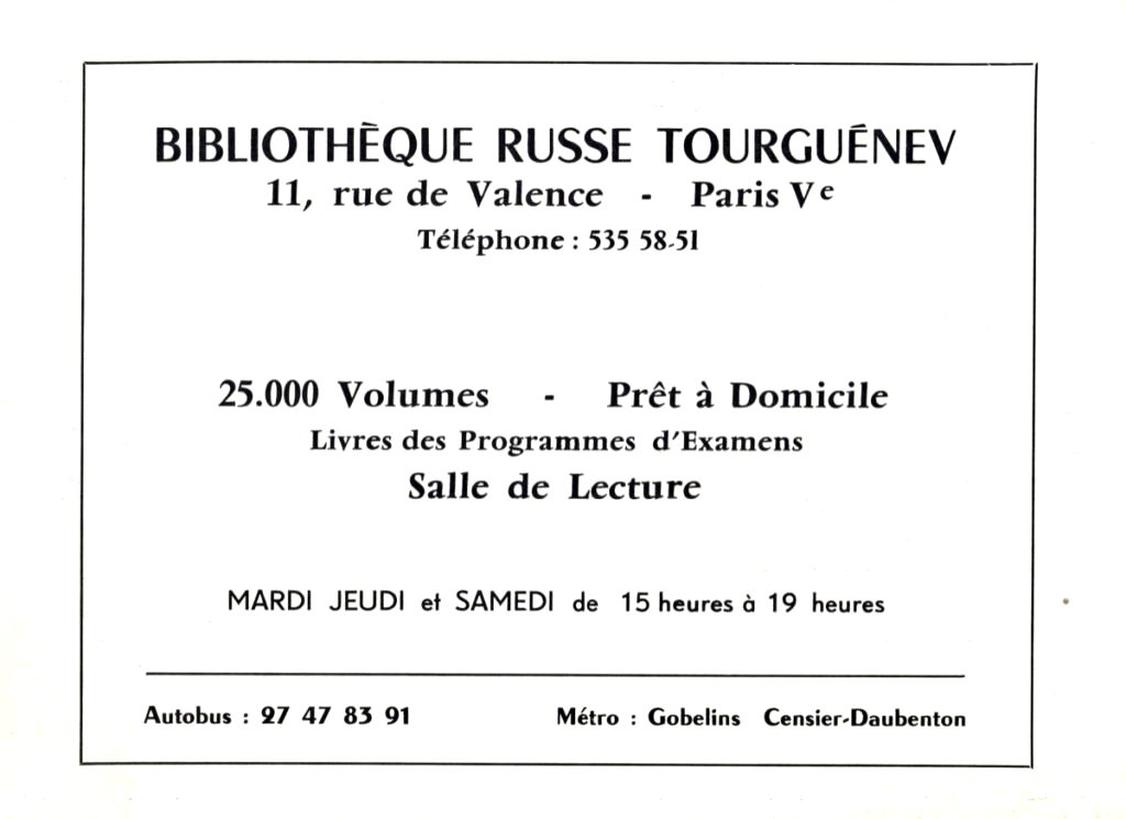 В 1957–1959 годы историк, профессор Парижского университета Татьяна Алексеевна Бакунина-Осоргина с группой единомышленников предприняла восстановление парижской Тургеневской библиотеки – новые фонды пополнялись дарителями-соотечественниками. А в 1959-м Русская общественная библиотека им. И.С. Тургенева была открыта вновь по адресу: 11, rue Valence [см.: Русская общественная библиотека имени И.С. Тургенева. Сотрудники. Друзья. Почитатели. Paris, 1987].