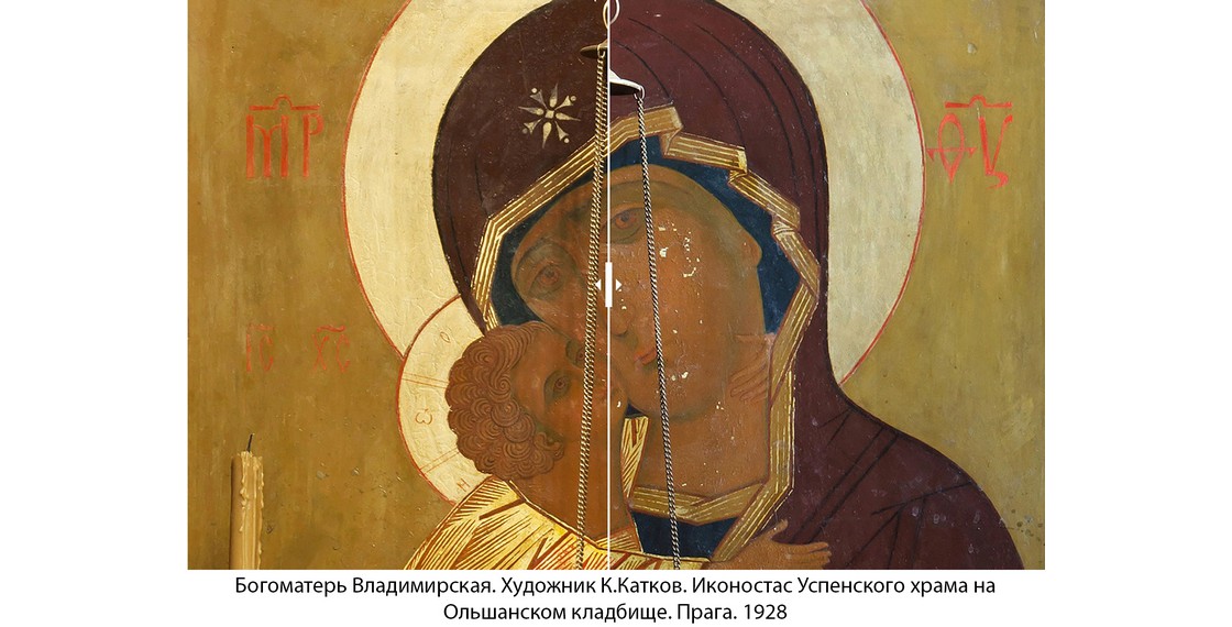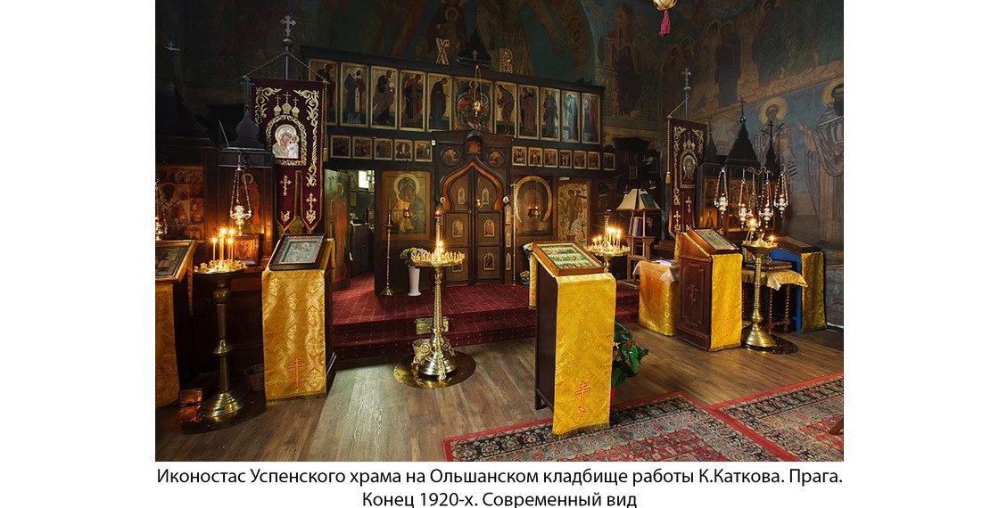 Первым местом его работы как иконописца стал Успенский храм на Ольшанском кладбище в Праге, построенный русскими эмигрантами, бежавшими от большевиков. Проект храма в неорусском стиле разработал архитектор Владимир Брандт совершенно бескорыстно. В этом проекте участвовали также его ученики — Николай Пашковский и Сергей Клодт. А строили его сотни русских, прибывших из России после Гражданской войны. Освятил храм 22 ноября 1925 года специально приехавший в Прагу из Парижа митрополит Евлогий. Эскизы мозаик и фресок для внутреннего убранства храма сделал Иван Яковлевич Билибин. Летом 1927 года появилась первая мозаика архангела Михаила, выполненная в пражской мозаичной мастерской Марии Ферстровой. Через год над главным входом установили большую мозаику Знамения Пресвятой Богородицы. Внутренние работы в храме затягивались. Завершить их смогли только в первые годы Второй мировой войны. Четырехярусный иконостас же храма был готов уже в конце 1920-х годов. Все 64 иконы для него и клиросных преград были выполнены двадцатилетним Кириллом Катковым.