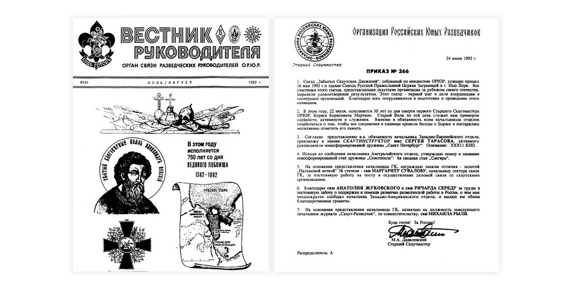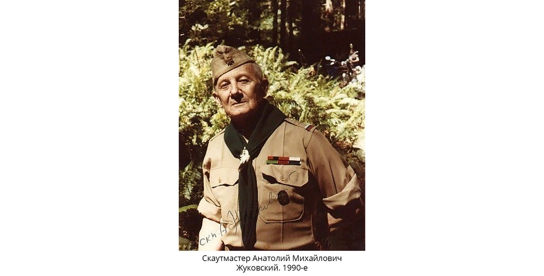 «Скаутом я стал в 1920 году, когда ехал с родителями на пароходе в Салоники. Там был один скаутмастер из Евпатории Петр Александрович Берников. По прибытии в Салоники он организовал отряд, и я вступил в него. Увлечение это тянется нитью через мою жизнь. Примкнув к скаутизму, я никогда его не оставлял. Когда я был начальником отряда в Белграде, мы ходили в походы на гору Аваал, в двадцати километрах от Белграда. <…> Мы называли себя рыцарями Аваальского замка. <…> В годы войны было не до скаутства. В Германии жили скауты, но мы не поддерживали связи. После войны мы были с труппой Базиля в Испании. Я носил на рубашке скаутскую лилию. <…> В Бельгии, работая в королевском театре, познакомился с католическими скаутами. Их дружина в Генте устраивала раз в год вечер для сбора средств. Я им поставил спектакль с играми и танцами. В 1947 году, когда я служил во французской армии, офицеры-скауты пригласили меня поехать с ними на фестиваль. В день открытия был парад. Каждая секция шла со своим флагом. Я развернул Андреевский флаг и шел один. Других русских флагов на празднике не было. После парада меня пригласили в канцелярию фестиваля. Представитель международного бюро, английский полковник Вильсон спросил: “Что это значит? России нет и нет русских скаутов, а пионеров мы не признаем. Кого вы представляете?”. Он объяснил, что не хочет конфликтов с союзниками. <…> С первых дней в Америке я работаю в скаутской организации — 5-й отряд Ермака Тимофеевича. Я — ископаемое: самый старый из живущих скаутов. Меня показывают молодым. “Этот и есть самый старый?!”. И трогают меня: настоящий?!». Прибыв в США, Анатолий Михайлович сразу присоединился к Организации российских юных разведчиков (ОРЮР), стал начальником ее Западно-Американского отдела. В течение 22 лет он был членом Совета и 33 года — членом Главного суда чести ОРЮР. Жуковский также был редактором бюллетеня «Вестник руководителя» до 1980 года и содействовал объединению ОРЮР с НОРС (Национальной организацией русских скаутов). В начале 1990-х годов, приехав в Россию, он много времени посвящал воскресающему на родине скаутизму. Ведь известно, что пришедшие к власти большевики в 1923 году закрыли все скаутские организации. Кто-то отошел от скаутской работы и прервал связи с друзьями, кто-то — нет. Одна из подпольных скаутских песен того времени звучала так: