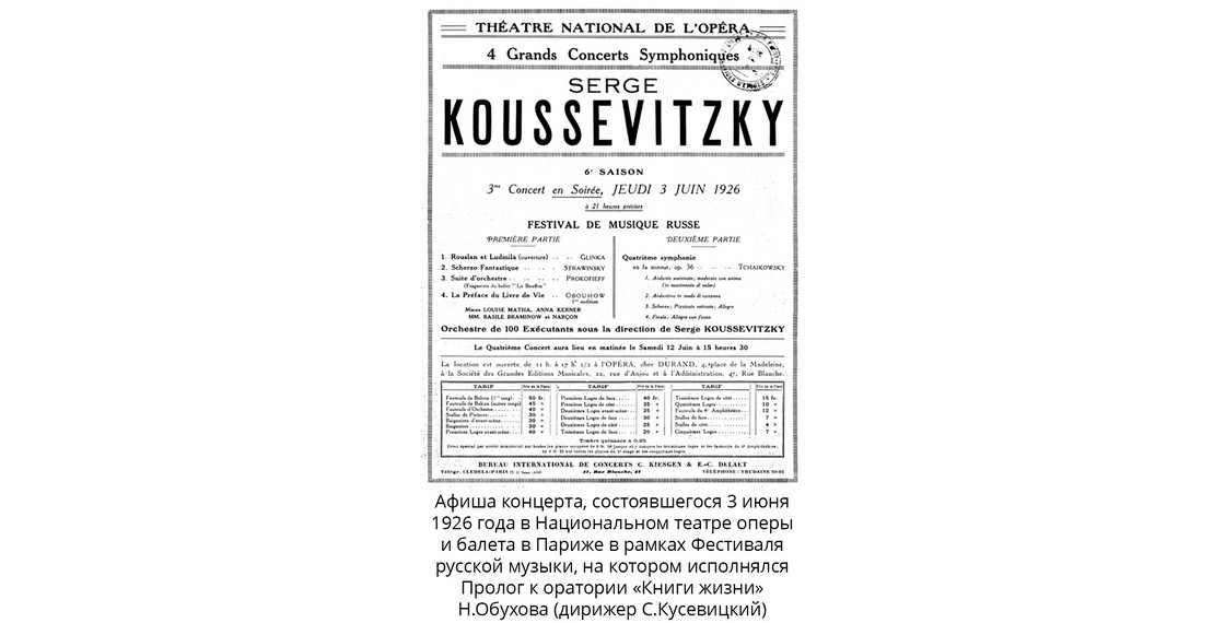 Сочинения для звучащего креста Обухова — «Всемогущий благословляет мир», «Вечная жизнь», «Коронация» и другие — были с большим успехом исполнены в феврале 1934 года в Брюссельской консерватории, а 15 мая 1934 года — в зале «Гаво». В концертах принимали участие певицы Сюзанна Бальгери, Луиза Мата и пианистка Мария-Антуанетта Оссенак де Бройль, овладевшая в совершенстве игрой на кресте, ставшая убежденной последовательницей и сотрудницей Николая Борисовича.