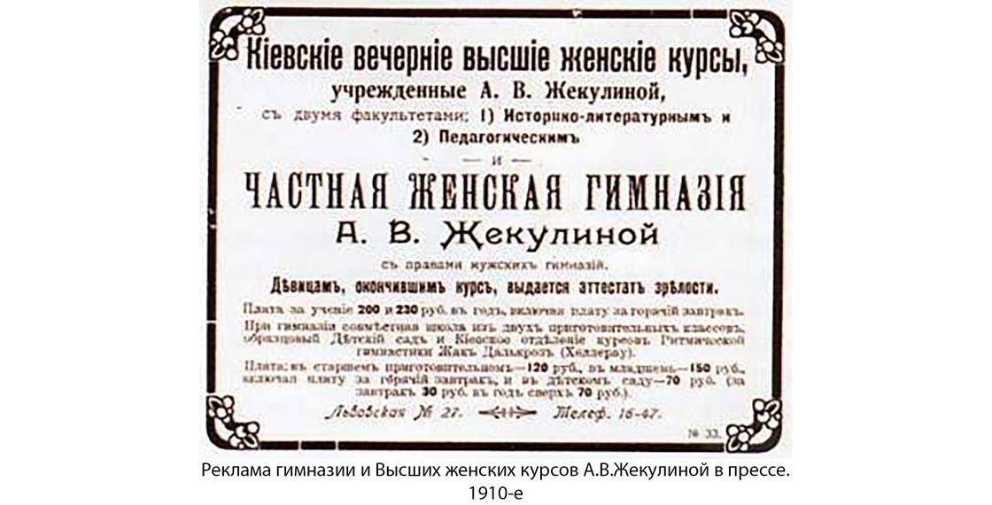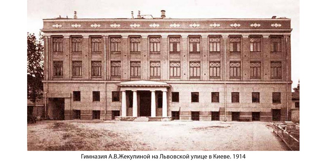 Проживая в Киеве, она занималась любимым делом, стала основателем и директором одной из лучших в городе частных женских гимназий, расположенной сначала на Большой Подвальной, 36, а после 1913 года переехавшей в новое здание на Львовской улице, 27. Гимназия Жекулиной заметно отличалась от большинства женских учебных заведений города. Можно даже сказать, что Аделаида Владимировна стала реформатором женского образования. Исследователь киевской старины, писатель Михаил Кальницкий отмечал, что она стремилась организовать свое заведение не для барышень, мечтавших поскорее получить какое-нибудь образование и выскочить замуж, а для девушек, рассчитывающих в жизни на собственные силы. В 1905 году ее усилиями при гимназии были открыты Высшие женские курсы (историко-литературное отделение). Они сначала были вечерними одногодичными, а с 1907 года — четырехгодичными. А с 1906 года в ее гимназии — одной на весь Киев — была принята программа мужских средних учебных заведений. Там преподавали отличные педагоги, а выпускницы могли продолжить образование на ее вечерних Высших курсах. В то время в женских гимназиях не было математических дисциплин — алгебры, геометрии и тригонометрии, языков — церковнославянского, древнегреческого и латыни. Впервые эти предметы появились в женской гимназии именно у Жекулиной. Более того, кроме привычных — истории, физики, географии, рисования, пения, танцев, чистописания, языков — английского, немецкого, французского, — в гимназии читали психологию, правоведение, космографию, логику, философскую пропедевтику. Сама же Жекулина преподавала в гимназии французский язык. Ценой невероятных усилий Аделаида Владимировна добилась также предоставления прав ее выпускницам на поступление без экзаменов в Женский медицинский институт и другие вузы. Популярность учебного заведения неуклонно росла. Сохранилась запись о количестве учащихся в первые годы работы гимназии: в 1905 году — 20 учениц; в 1907 году — 41; в 1908 году — 122; в 1910 году — 158; в 1911 году — 204; в 1912 году — 268… Конечно же, нужно было новое помещение, тем более, что Жекулина уже мечтала не просто о новой школе, а о целом учебном комплексе, включающем подготовительную школу из двух классов, гимназию-восьмилетку, детский сад и Высшие женские курсы.