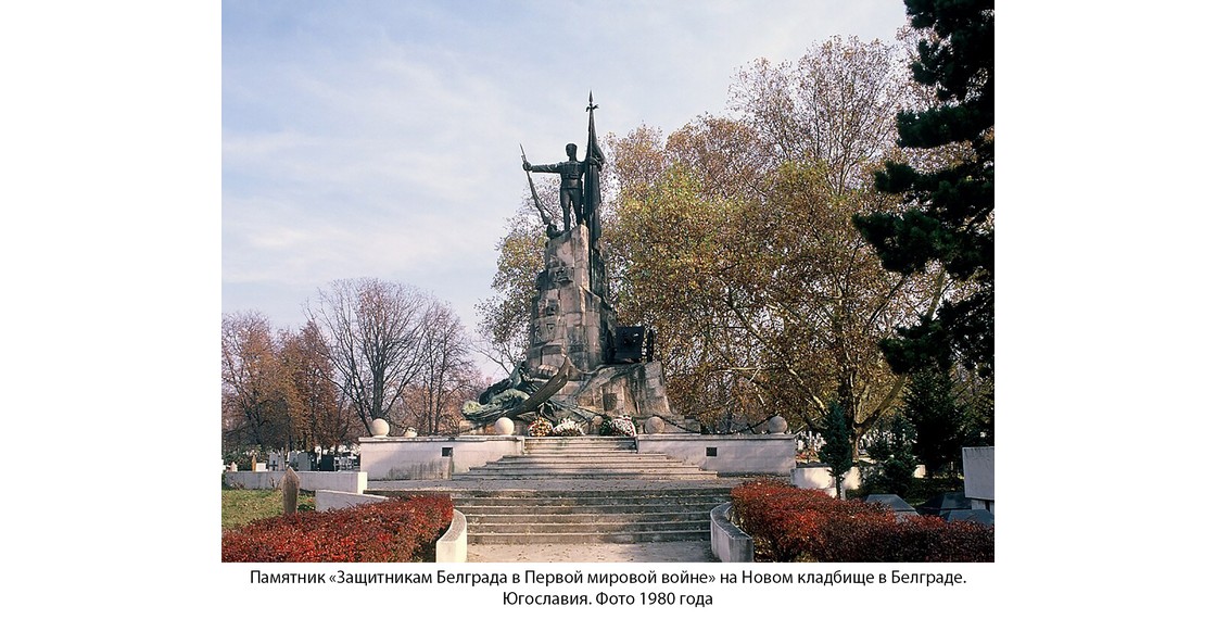 Первый монумент — «Защитникам Белграда» — стал самым высоким на Балканах военным памятником — 18 метров высоты. Герой (югославский воин-победитель) гордо держит знамя и опирается на винтовку, у его ног — смертельно раненный орел (высотой 14 метров), символизирующий поверженную Германию. Обе фигуры отлиты из темной меди, хотя весь памятник выполнен из серого камня. Композиция выражает идею победы Добра над Злом. Памятник воздвигнут над братской могилой нескольких тысяч воинов. Среди сербских фамилий можно встретить и фамилии русских офицеров.