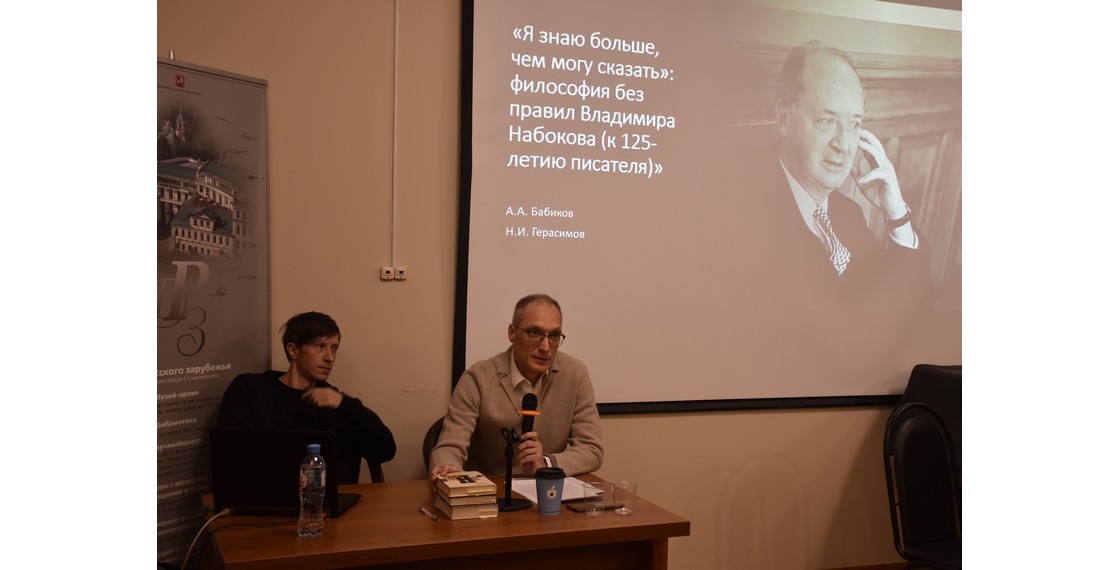 8 ноября 2024 года в рамках научно-просветительского проекта «Отражения» состоялась лекция-дискуссия исследователя литературы русского зарубежья, переводчика и комментатора В.В.Набокова Андрея Александровича Бабикова (ДРЗ) и кандидата философских наук, специалиста по философии русской эмиграции XX века Николая Игоревича Герасимова (ДРЗ).