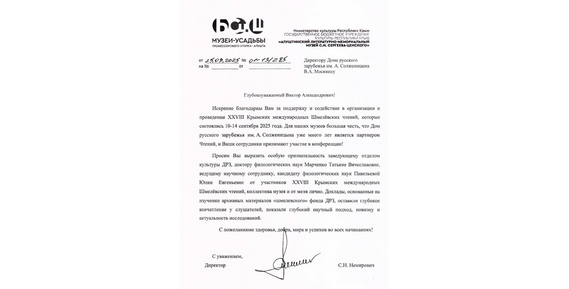 Искренне благодарны Вам за поддержку и содействие в организации и проведении XXVIII Крымских международных Шмелевских чтений, которые состоялись 10–14 сентября 2025 года. Для наших музеев большая честь, что Дом русского зарубежья имени А.Солженицына уже много лет является партнером Чтений и Ваши сотрудники принимают участие в конференции!