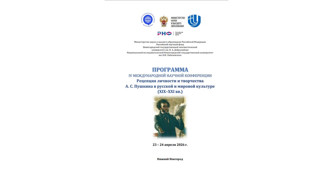 23–24 апреля 2026 года в Нижегородском государственном лингвистическом университете им. Н.А.Добролюбова была проведена IV Международная научная конференция «Рецепция личности и творчества А.С.Пушкина в русской и мировой культуре (XIX–XXI веков)».