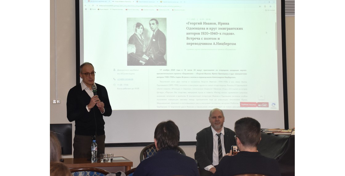 17 ноября 2025 года в Доме русского зарубежья им. А.Солженицына в рамках регулярных научно-просветительских собраний «Отражения» прошла встреча с известным поэтом и переводчиком Александром Ницбергом и состоялась лекция, посвященная взаимоотношениям Георгия Иванова и Ирины Одоевцевой с писателями и поэтами русского зарубежья.