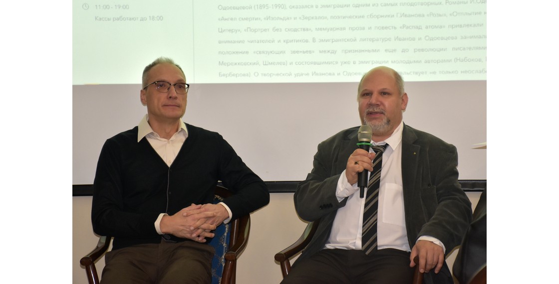 В начале выступления исследователь литературы русского зарубежья, составитель и редактор серии «Набоковский корпус» Андрей Бабиков представил слушателям гостя и остановился на главных обстоятельствах биографии и творчества одной из самых талантливых и плодовитых супружеских пар первой волны русской эмиграции. Он, кроме того, рассмотрел их взаимоотношения с поэтической группой «Перекресток», объединившейся вокруг В.Ф.Ходасевича, и с близким им направлением «Парижская нота», возглавлявшимся Г.Адамовичем. При этом А.Бабиков обратил внимание на еще малоизученный аспект творчества Иванова и Одоевцевой: заметные при всей разности их дарований внутренние тематические и стилистические переклички в стихах, прозе и мемуаристике двух авторов.